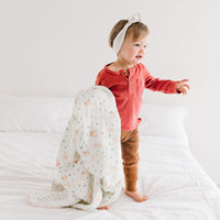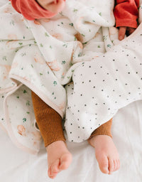 Our muslin quilts made from four layers of bamboo and cotton muslin fabric offer the perfect amount of breathable warmth and coziness to keep the baby comfortable and relaxed. This large reversible blanket is lightly quilted and features hand-drawn watercolor prints. Our multi-purpose muslin quilt blankets are generously sized, measuring 47" x 47" to grow with baby through the toddler years, and are great for tummy time, playtime, and as a stroller blanket. Manufactured at an OEKO-TEX Standard 100 certified factory, you can feel confident that our blankets are free of toxic chemicals and always safe for your baby.