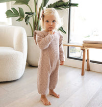 Mira Romper is designed with a textured sweater heather knit that's so soft and cozy for all day play. Buttons down the back for easy ons and offs, and ruffles on shoulders add dainty details on this minimalist dream.
